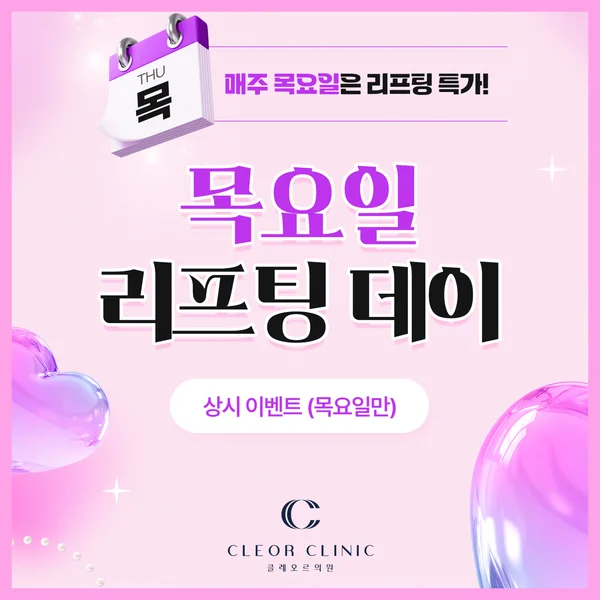 매주 목요일에 적용되는 이벤트 입니다. 카카오톡 플러스친구 대상 적용되는 이벤트 혜택입니다. 이벤트 구성은 원내 상황에 따라 종료 혹은 변경될 수 있습니다. VAT는 별도입니다.